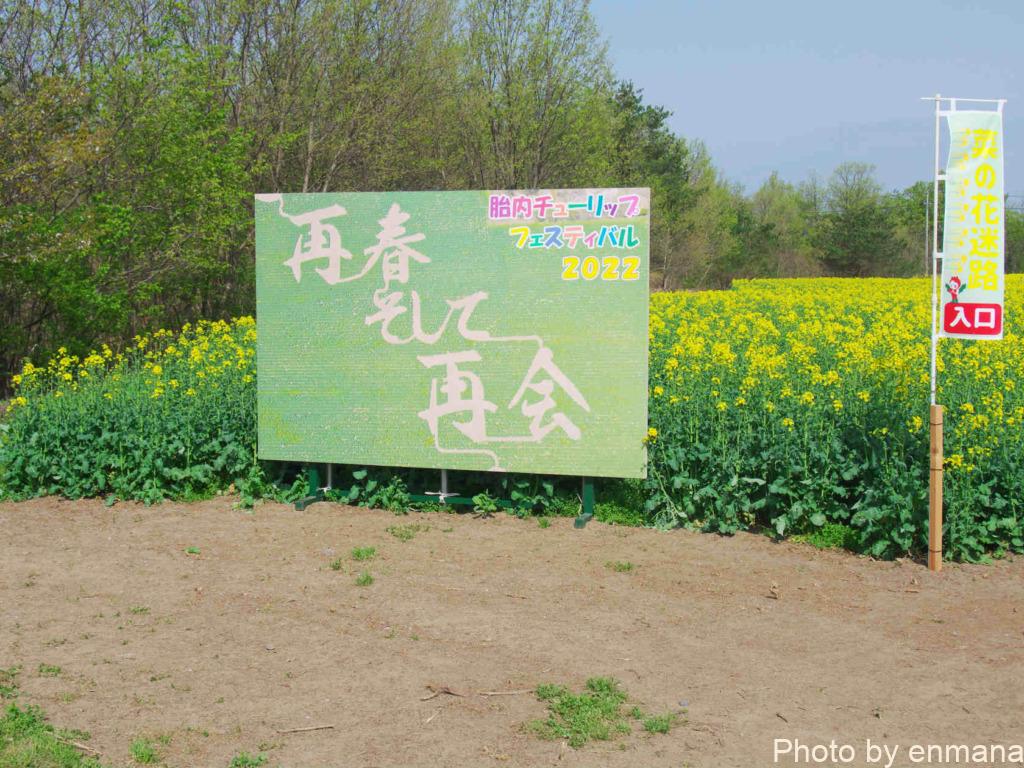 今年のチューリップフェスティバルでの菜の花畑は、「再春そして再会」という文字が描かれています。