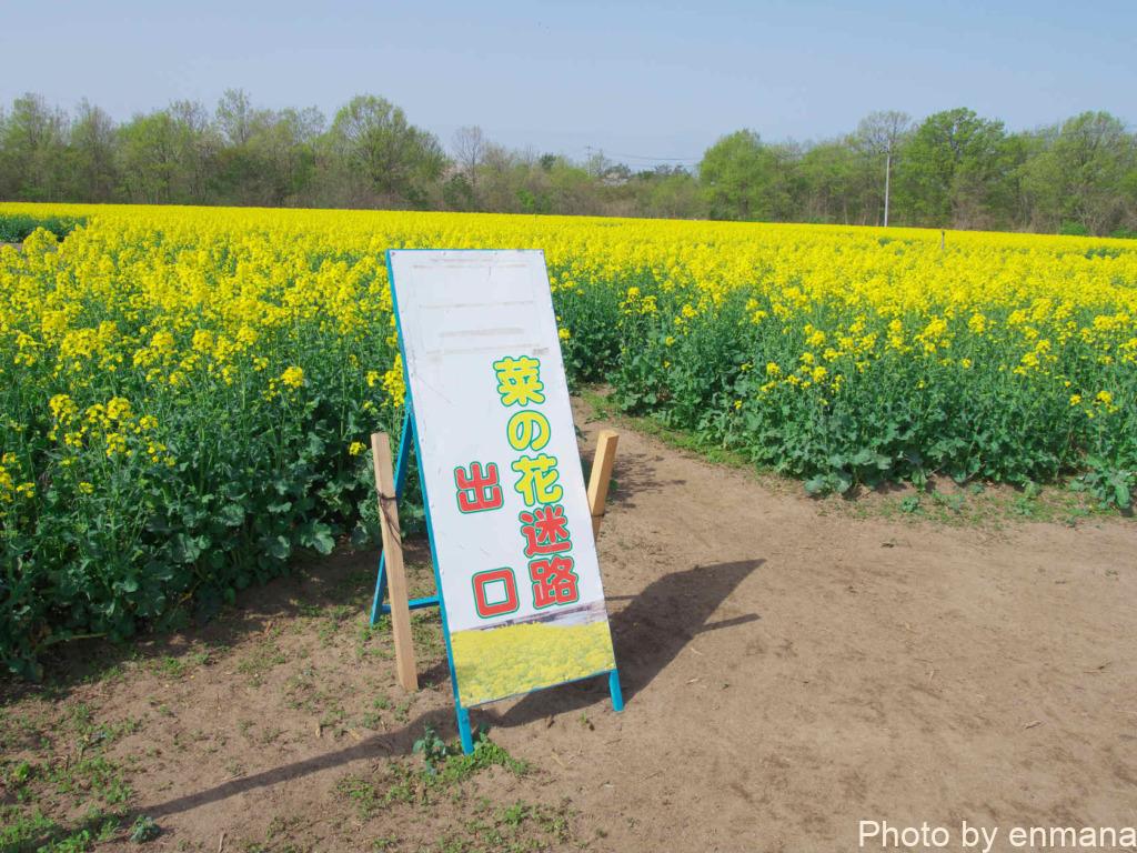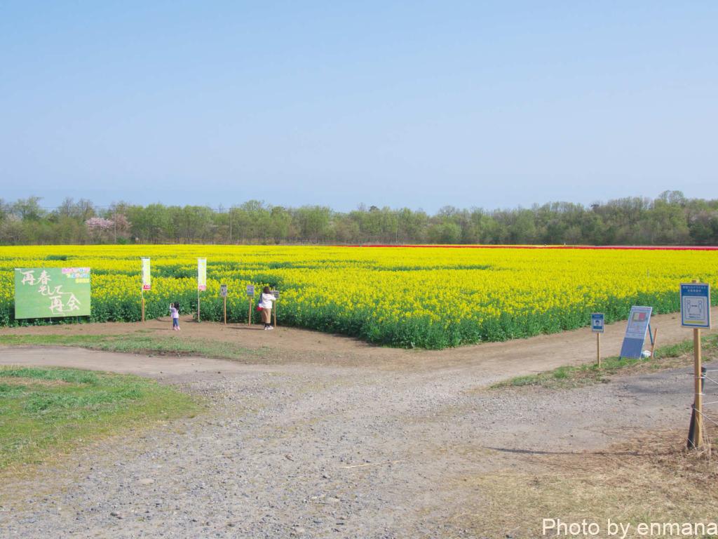 菜の花畑の中を通るのも良いですし、横目に見ながらチューリップを先に見に行くのも良いですよ。