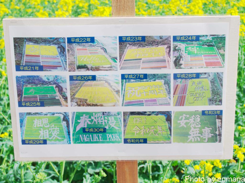 菜の花畑の前には数年分の文字が描かれた写真が飾られていました。