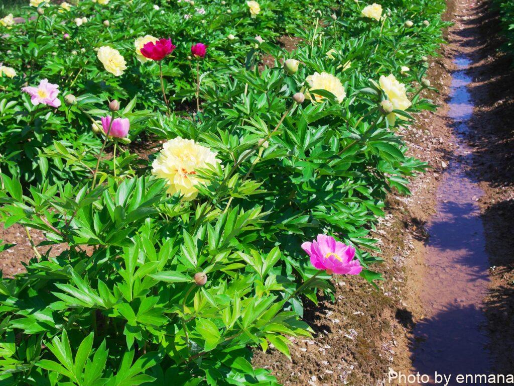 雨が降った後は、水たまりに反射したしゃくやくの花も綺麗ですよ。