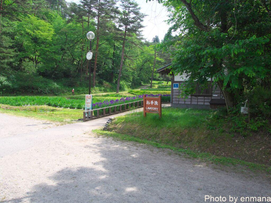 アヤメが咲いている場所は、アヤメ園のトイレのわきの方です。