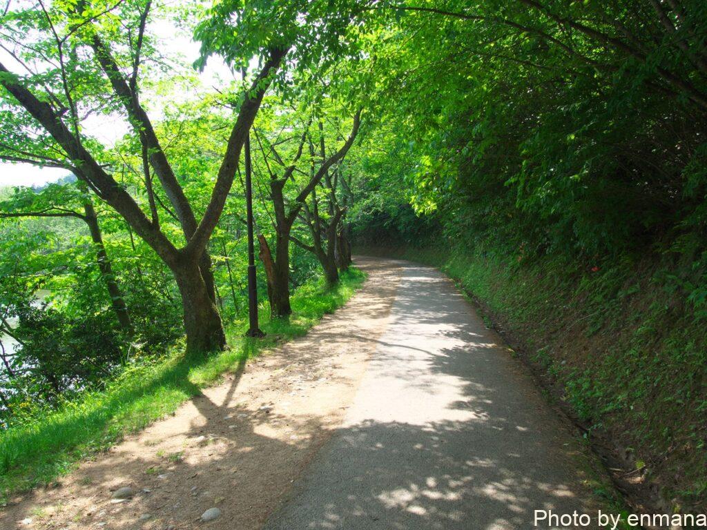 升潟横の通路は、片側が池で片側が斜面となっており自然を満喫することができます。
